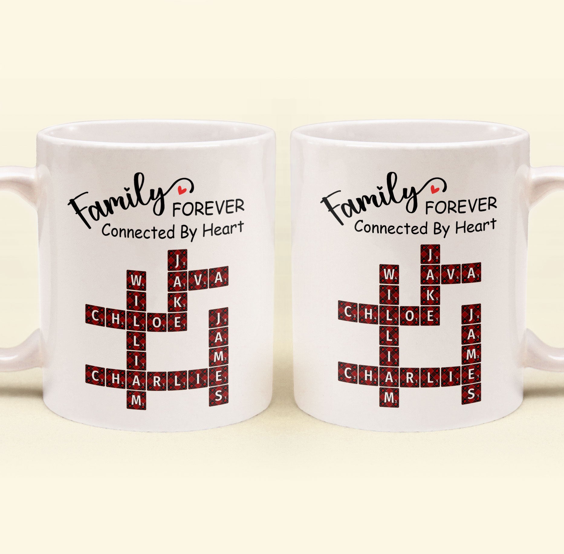 Celebrate the unbreakable bond of family with our Personalized Mug featuring the heartwarming phrase, “Family Forever Connected By Heart.” This unique mug allows you to customize each family member’s name in a charming Scrabble-style crossword, creating a beautiful reminder of the connections that make your family special. Perfect for sipping coffee, tea, or any favorite drink, it’s a daily dose of warmth and love.