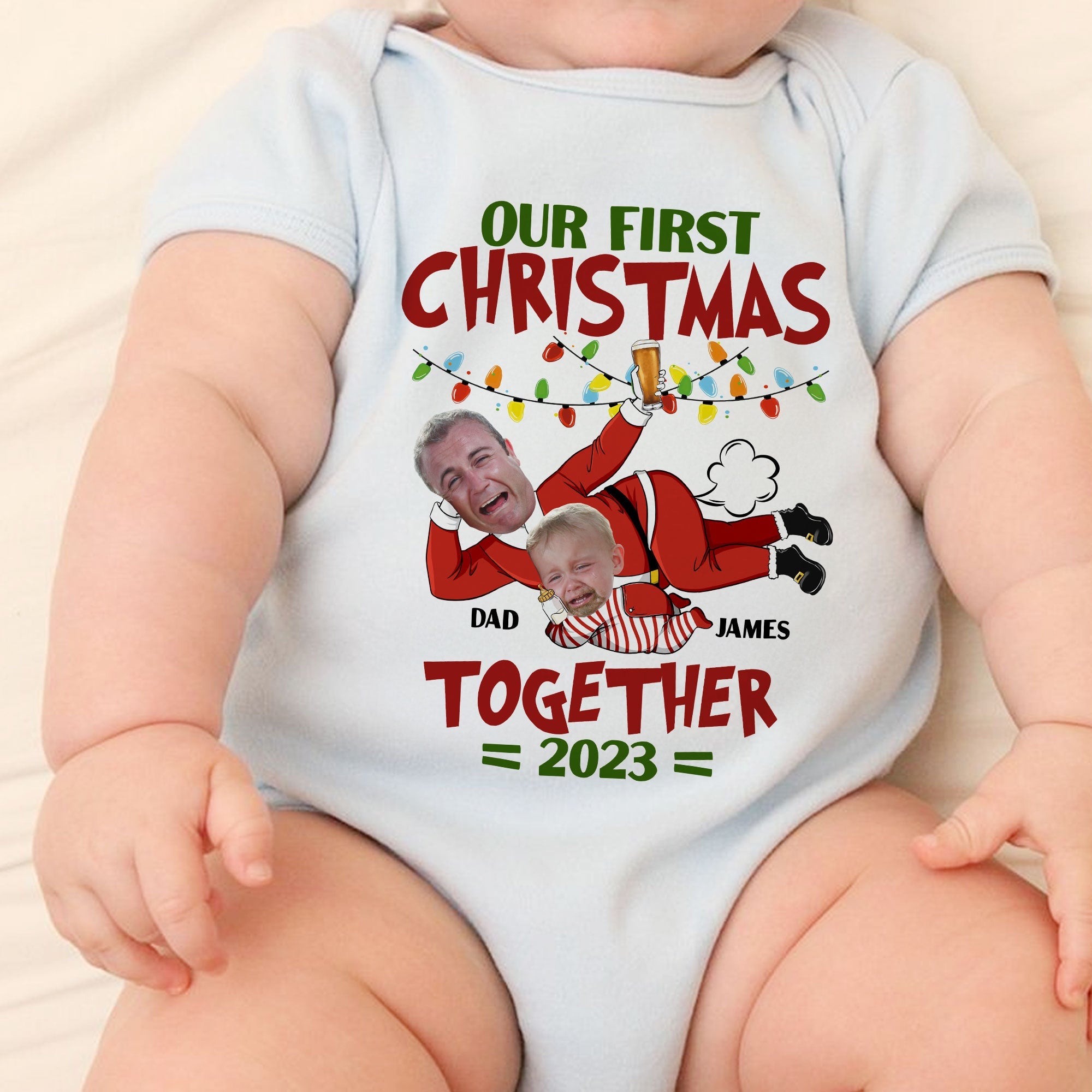 Upload your favorite photo and make one-of-a-kind outfit for this Christmas for newborn baby and new dad!